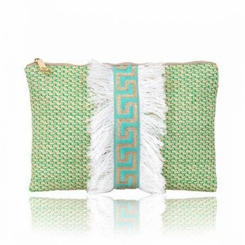 A square zipped wicker clutch with a significant Greek meander pattern in mint colour and fringed edges.