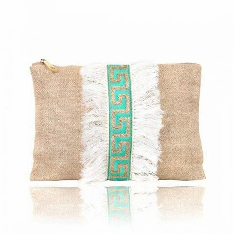 A square zipped clutch made of lurex canvas with a significant Greek meander pattern in mint colour and fringed edges.
